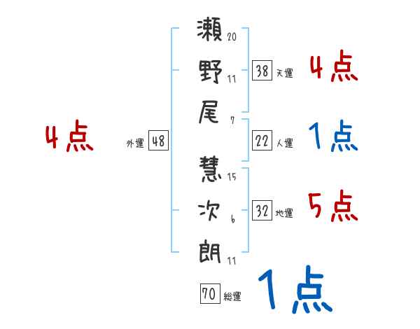 地運![]() | 瀬野尾慧次朗さんの地運は32画の5つ星!柔軟性があり成功する。チャンスが多く金運が良い。 個性を表す基礎的な運勢です。性格形成や対人関係、行動力など家庭環境に影響されます。主に誕生してから20歳くらいまでの若年期の運勢を表します。 |