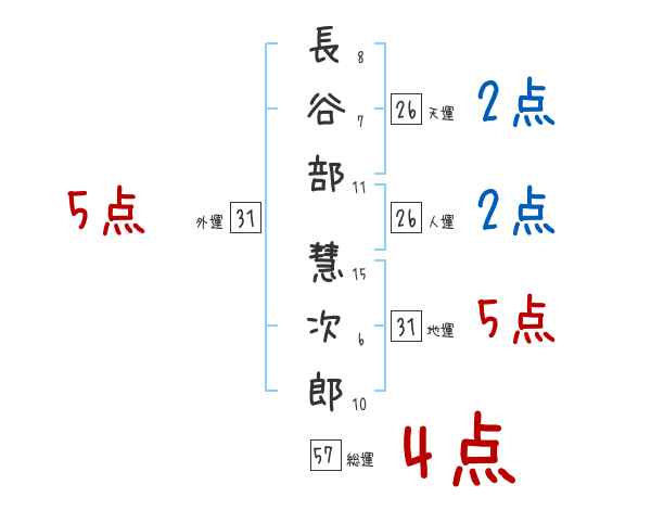 総運![]() | 長谷部慧次郎さんの総運は57画の4つ星!向上心があり人望がある。地位を得る。 あなたの人生を表す1番重要な運勢です。生涯を通じて影響する総合運となり、主に50歳以降の晩年期に影響を及ぼします。 |