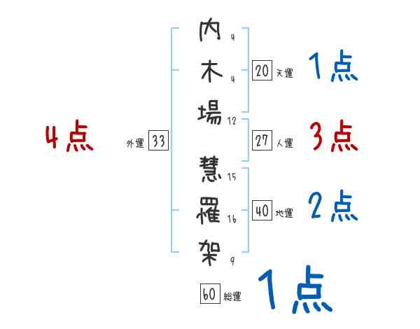外運![]() | 内木場慧罹架さんの外運は33画の4つ星!権力志向でプライドが高い。勇気があり運を切り開き成功する。 生活面を象徴する運勢です。外部から受ける影響力を表し、結婚運、家庭運や職場、環境への順応性を表します。 |
