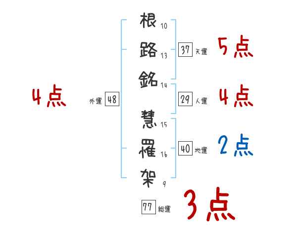 人運![]() | 根路銘慧罹架さんの人運は29画の4つ星!完全主義で才能がある。厳格な心の持ち主。 性格や才能などを表す2番目に重要な運勢です。人間関係や協調性、社会的な成功に影響します。主に20歳から50歳ぐらいまでの中年期の運勢を表します。 |