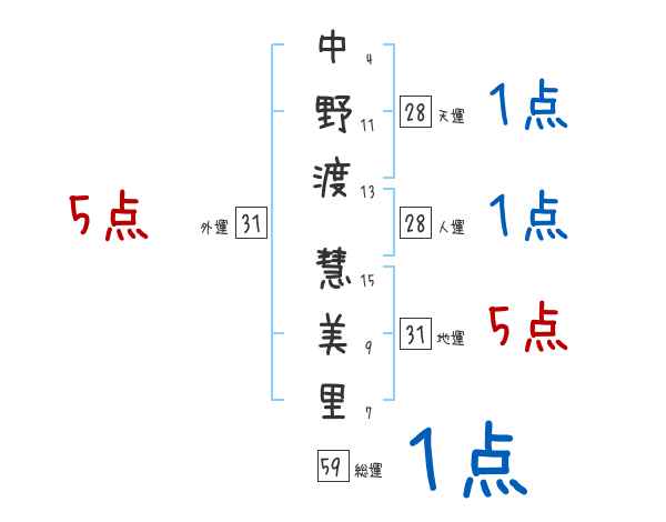 天運![]() | 中野渡慧美里さんの天運は28画の1つ星!家庭環境に注意。スポーツで活躍できる能力があるかも。 家系が持つ宿命的な運勢を表します。祖先から受け継いだ苗字ですので自分の力が及びません。家柄を象徴します。 |