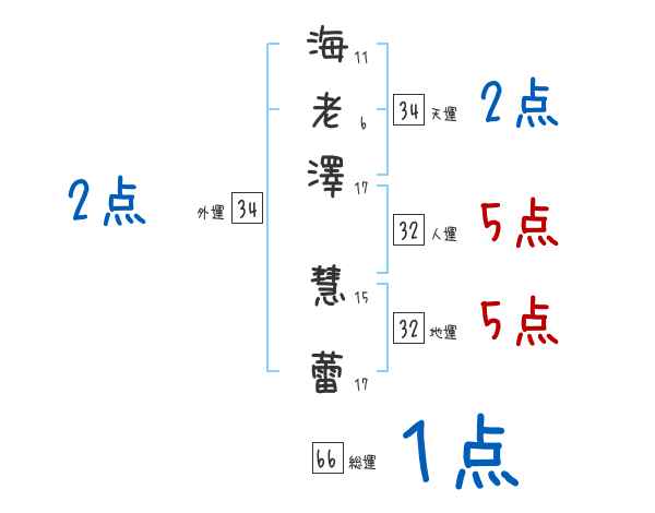 人運![]() | 海老澤慧蕾さんの人運は32画の5つ星!柔軟性があり成功する。チャンスが多く金運が良い。 性格や才能などを表す2番目に重要な運勢です。人間関係や協調性、社会的な成功に影響します。主に20歳から50歳ぐらいまでの中年期の運勢を表します。 |