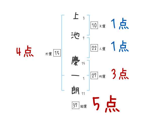 総運![]()  | 上池慶一朗さんの総運は37画の5つ星!努力家で順応性に優れる。現実的な考え方ができ忠実に物事をこなす。 あなたの人生を表す1番重要な運勢です。生涯を通じて影響する総合運となり、主に50歳以降の晩年期に影響を及ぼします。 |