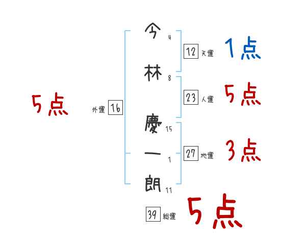 外運![]() | 今林慶一朗さんの外運は16画の5つ星!人望が厚く大きく発展する。逆転成功が見える。 生活面を象徴する運勢です。外部から受ける影響力を表し、結婚運、家庭運や職場、環境への順応性を表します。 |