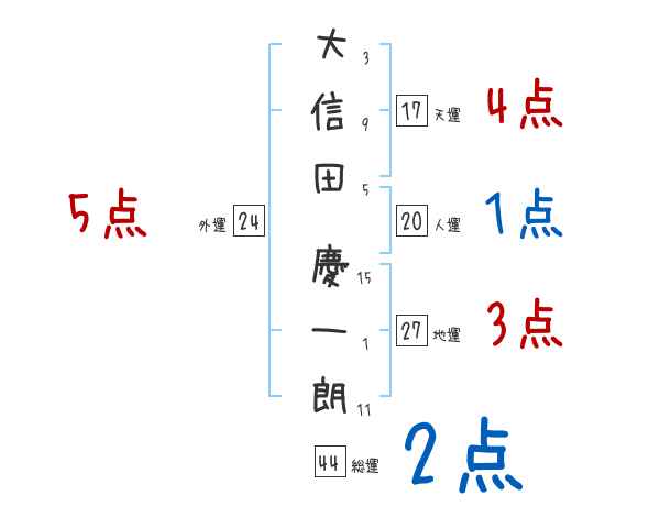 外運![]() | 大信田慶一朗さんの外運は24画の5つ星!家庭運が良く順調な人生。金運にも恵まれる。 生活面を象徴する運勢です。外部から受ける影響力を表し、結婚運、家庭運や職場、環境への順応性を表します。 |