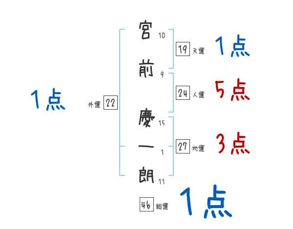 外運![]() | 宮前慶一朗さんの外運は22画の1つ星!努力することが苦手ないっぽう手先が器用。芸術性にも優れる。 生活面を象徴する運勢です。外部から受ける影響力を表し、結婚運、家庭運や職場、環境への順応性を表します。 |