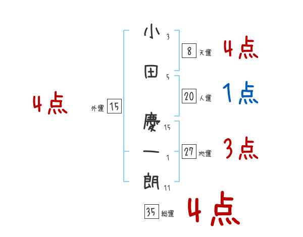 総運![]() | 小田慶一朗さんの総運は35画の4つ星!温厚な性格で感受性が高い。穏和な性格で人望が厚い。 あなたの人生を表す1番重要な運勢です。生涯を通じて影響する総合運となり、主に50歳以降の晩年期に影響を及ぼします。 |