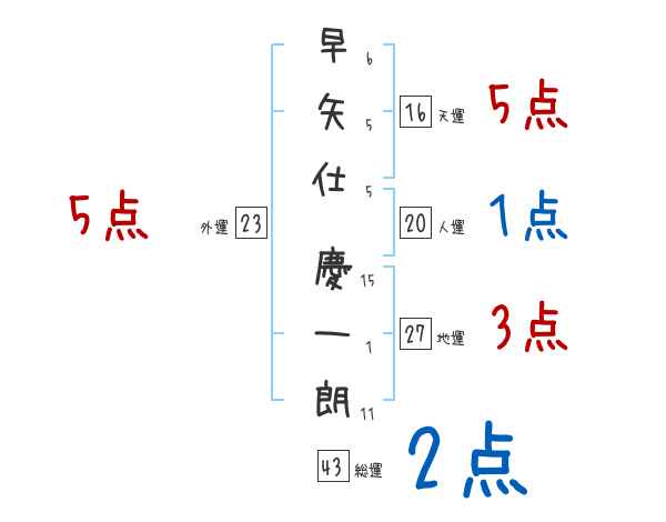 外運![]() | 早矢仕慶一朗さんの外運は23画の5つ星!想像力に優れ活力がある。一代で成功し名誉を手に入れる。 生活面を象徴する運勢です。外部から受ける影響力を表し、結婚運、家庭運や職場、環境への順応性を表します。 |