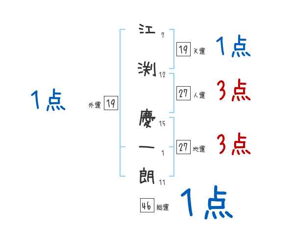 外運![]() | 江渕慶一朗さんの外運は19画の1つ星!優れた才能を持ちますが、協調性が足りないことも。周りの人と協力する事を意識しましょう。 生活面を象徴する運勢です。外部から受ける影響力を表し、結婚運、家庭運や職場、環境への順応性を表します。 |