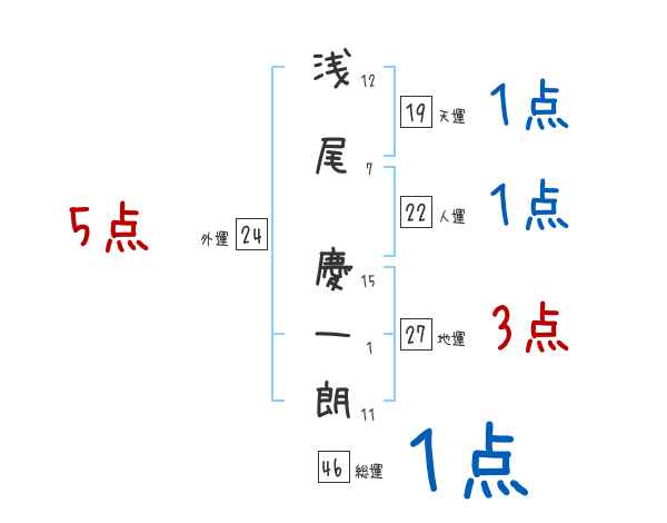 外運![]() | 浅尾慶一朗さんの外運は24画の5つ星!家庭運が良く順調な人生。金運にも恵まれる。 生活面を象徴する運勢です。外部から受ける影響力を表し、結婚運、家庭運や職場、環境への順応性を表します。 |