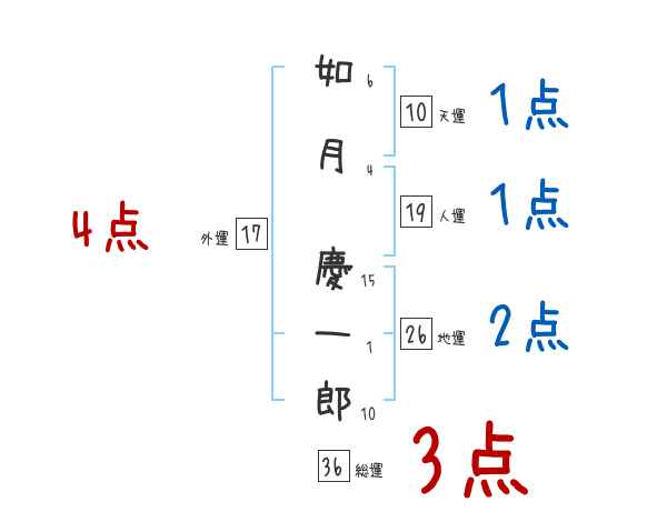天運![]() | 如月慶一郎さんの天運は10画の1つ星!不安を感じやすい傾向。ストレスを抱えないように注意しましょう。 家系が持つ宿命的な運勢を表します。祖先から受け継いだ苗字ですので自分の力が及びません。家柄を象徴します。 |
