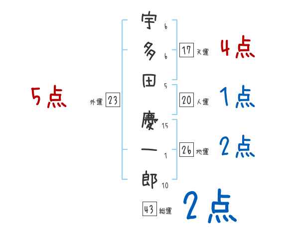 外運![]() | 宇多田慶一郎さんの外運は23画の5つ星!想像力に優れ活力がある。一代で成功し名誉を手に入れる。 生活面を象徴する運勢です。外部から受ける影響力を表し、結婚運、家庭運や職場、環境への順応性を表します。 |