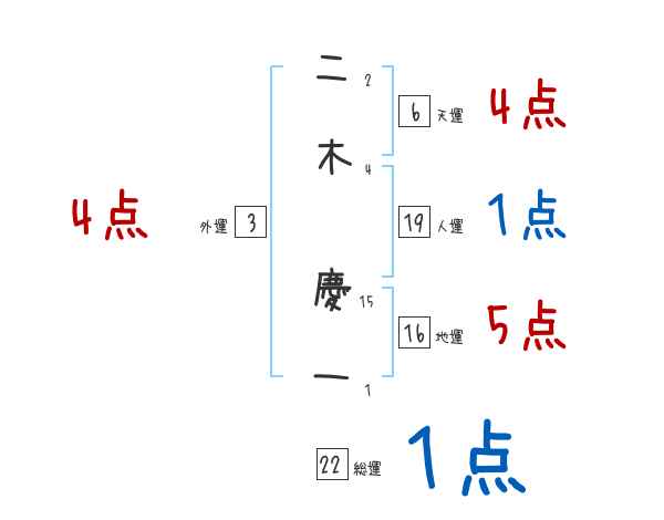 総運![]() | 二木慶一さんの総運は22画の1つ星!努力することが苦手ないっぽう手先が器用。芸術性にも優れる。 あなたの人生を表す1番重要な運勢です。生涯を通じて影響する総合運となり、主に50歳以降の晩年期に影響を及ぼします。 |