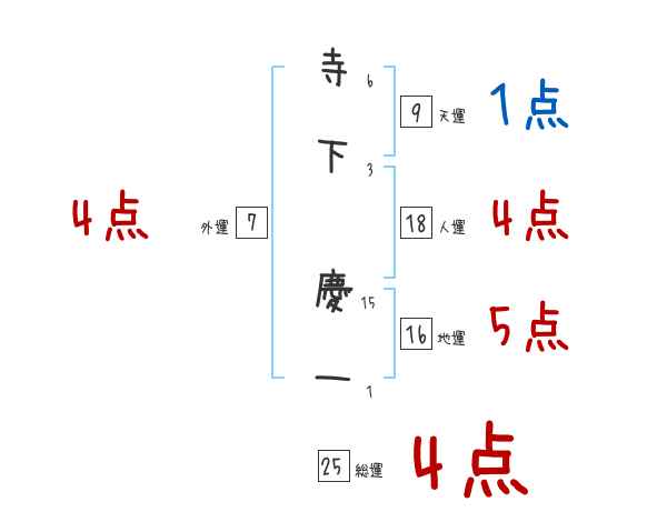 外運![]() | 寺下慶一さんの外運は7画の4つ星!強い意志や信念を持ち独立心が強い。自立する。 生活面を象徴する運勢です。外部から受ける影響力を表し、結婚運、家庭運や職場、環境への順応性を表します。 |