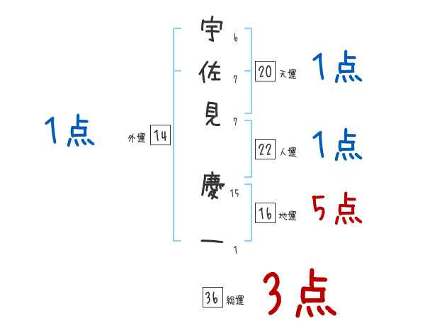 人運![]() | 宇佐見慶一さんの人運は22画の1つ星!努力することが苦手ないっぽう手先が器用。芸術性にも優れる。 性格や才能などを表す2番目に重要な運勢です。人間関係や協調性、社会的な成功に影響します。主に20歳から50歳ぐらいまでの中年期の運勢を表します。 |