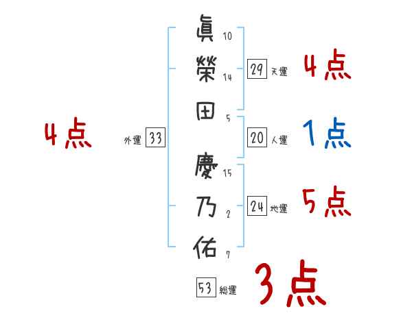天運![]() | 眞榮田慶乃佑さんの天運は29画の4つ星!完全主義で才能がある。厳格な心の持ち主。 家系が持つ宿命的な運勢を表します。祖先から受け継いだ苗字ですので自分の力が及びません。家柄を象徴します。 |