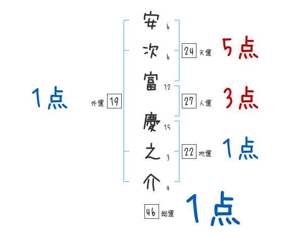 天運![]() | 安次富慶之介さんの天運は24画の5つ星!家庭運が良く順調な人生。金運にも恵まれる。 家系が持つ宿命的な運勢を表します。祖先から受け継いだ苗字ですので自分の力が及びません。家柄を象徴します。 |