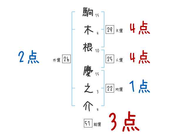 総運![]() | 駒木根慶之介さんの総運は51画の3つ星!変化が激しく、危険に注意。堅実な性格。 あなたの人生を表す1番重要な運勢です。生涯を通じて影響する総合運となり、主に50歳以降の晩年期に影響を及ぼします。 |