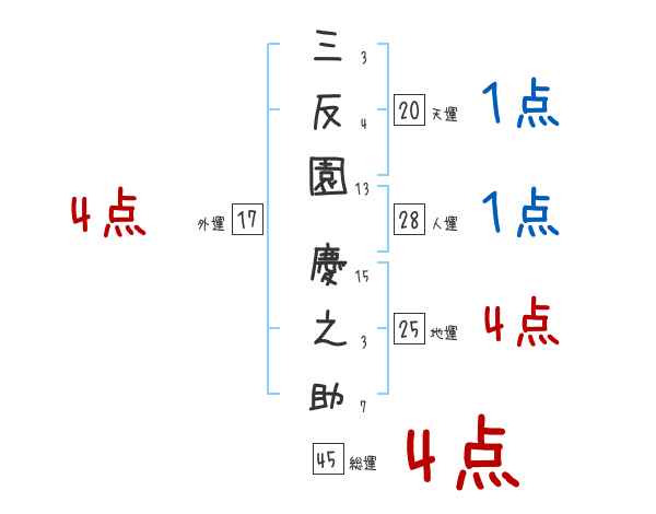 総運![]() | 三反園慶之助さんの総運は45画の4つ星!もくもくと物事を進め達成する。地味な努力家。 あなたの人生を表す1番重要な運勢です。生涯を通じて影響する総合運となり、主に50歳以降の晩年期に影響を及ぼします。 |