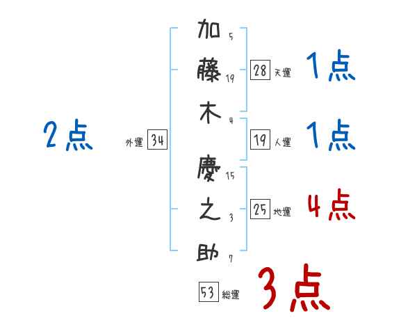 天運![]() | 加藤木慶之助さんの天運は28画の1つ星!家庭環境に注意。スポーツで活躍できる能力があるかも。 家系が持つ宿命的な運勢を表します。祖先から受け継いだ苗字ですので自分の力が及びません。家柄を象徴します。 |