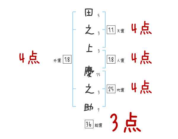 天運![]() | 田之上慶之助さんの天運は11画の4つ星!着実に富や地位を得る幸運な人生。 家系が持つ宿命的な運勢を表します。祖先から受け継いだ苗字ですので自分の力が及びません。家柄を象徴します。 |