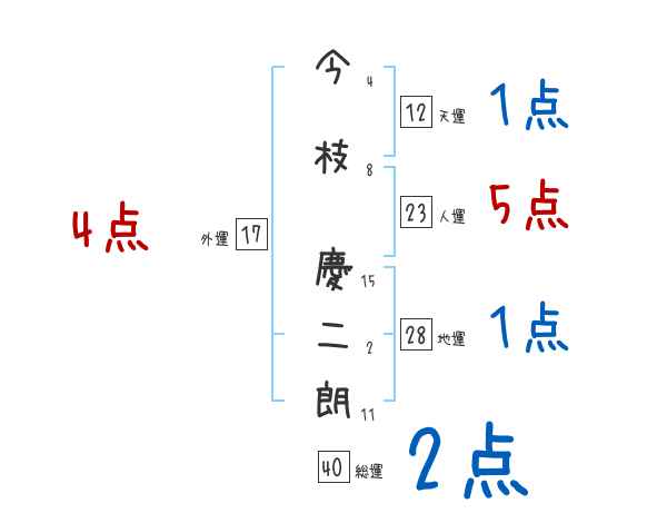 人運![]() | 今枝慶二朗さんの人運は23画の5つ星!想像力に優れ活力がある。一代で成功し名誉を手に入れる。 性格や才能などを表す2番目に重要な運勢です。人間関係や協調性、社会的な成功に影響します。主に20歳から50歳ぐらいまでの中年期の運勢を表します。 |