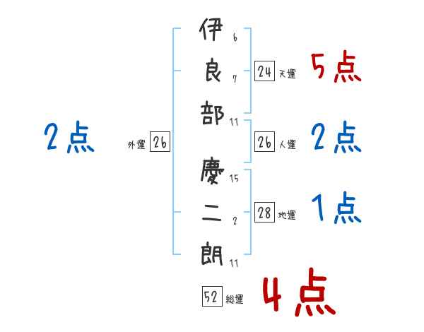 外運![]() | 伊良部慶二朗さんの外運は26画の2つ星!波瀾万丈かも。信頼できる人を大事にしましょう。 生活面を象徴する運勢です。外部から受ける影響力を表し、結婚運、家庭運や職場、環境への順応性を表します。 |