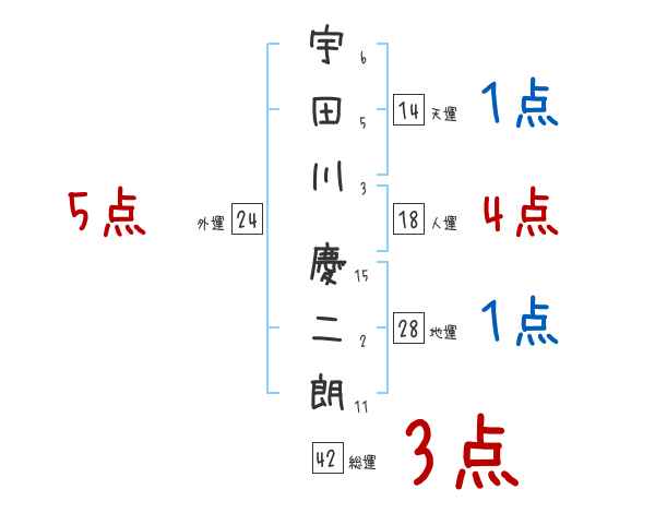 外運![]() | 宇田川慶二朗さんの外運は24画の5つ星!家庭運が良く順調な人生。金運にも恵まれる。 生活面を象徴する運勢です。外部から受ける影響力を表し、結婚運、家庭運や職場、環境への順応性を表します。 |