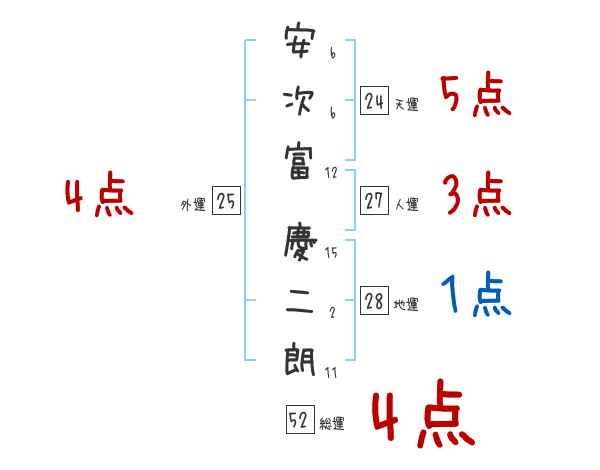 天運![]() | 安次富慶二朗さんの天運は24画の5つ星!家庭運が良く順調な人生。金運にも恵まれる。 家系が持つ宿命的な運勢を表します。祖先から受け継いだ苗字ですので自分の力が及びません。家柄を象徴します。 |