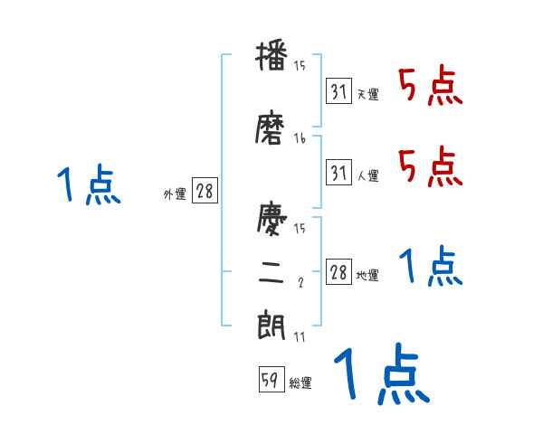 天運![]() | 播磨慶二朗さんの天運は31画の5つ星!社交性があり判断力に優れる。順風満帆な人生で円満な生活。 家系が持つ宿命的な運勢を表します。祖先から受け継いだ苗字ですので自分の力が及びません。家柄を象徴します。 |