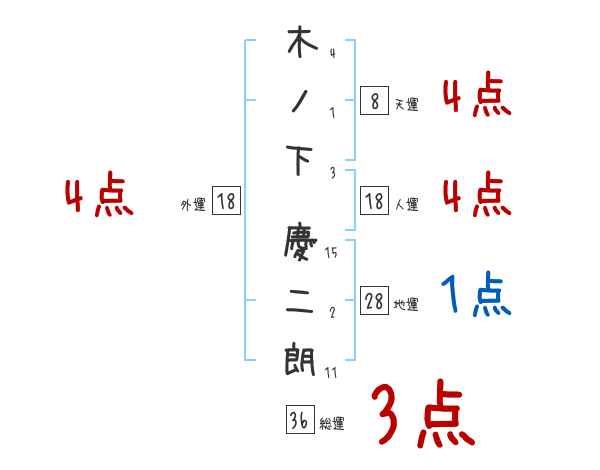 外運![]() | 木ノ下慶二朗さんの外運は18画の4つ星!情熱的で剛気。忍耐力があり信頼される。 生活面を象徴する運勢です。外部から受ける影響力を表し、結婚運、家庭運や職場、環境への順応性を表します。 |