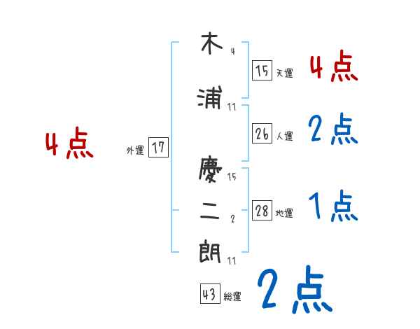 総運![]() | 木浦慶二朗さんの総運は43画の2つ星!頑固な性格で独立心が強いかも。やや非現実的で浪費に注意しましょう。 あなたの人生を表す1番重要な運勢です。生涯を通じて影響する総合運となり、主に50歳以降の晩年期に影響を及ぼします。 |