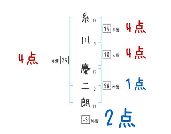 総運![]() | 糸川慶二朗さんの総運は43画の2つ星!頑固な性格で独立心が強いかも。やや非現実的で浪費に注意しましょう。 あなたの人生を表す1番重要な運勢です。生涯を通じて影響する総合運となり、主に50歳以降の晩年期に影響を及ぼします。 |