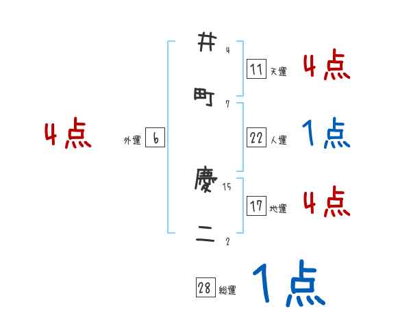 総運![]() | 井町慶二さんの総運は28画の1つ星!家庭環境に注意。スポーツで活躍できる能力があるかも。 あなたの人生を表す1番重要な運勢です。生涯を通じて影響する総合運となり、主に50歳以降の晩年期に影響を及ぼします。 |