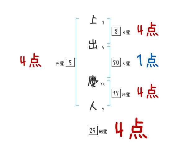 外運![]() | 上出慶人さんの外運は5画の4つ星!健康で安泰。協調性に優れ、財産に恵まれる。 生活面を象徴する運勢です。外部から受ける影響力を表し、結婚運、家庭運や職場、環境への順応性を表します。 |