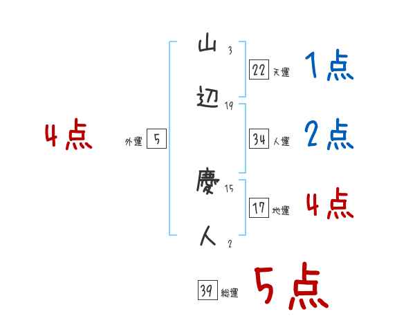 外運![]() | 山辺慶人さんの外運は5画の4つ星!健康で安泰。協調性に優れ、財産に恵まれる。 生活面を象徴する運勢です。外部から受ける影響力を表し、結婚運、家庭運や職場、環境への順応性を表します。 |