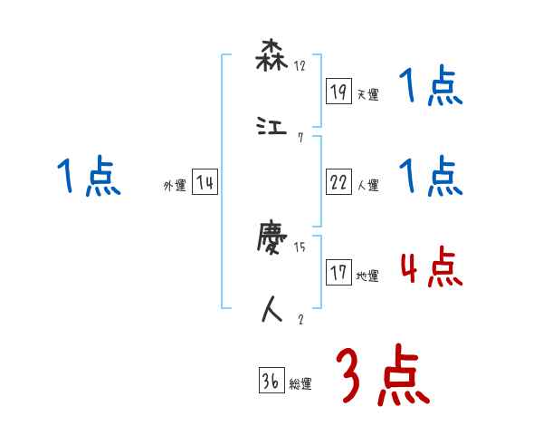 総運![]() | 森江慶人さんの総運は36画の3つ星!先見性が豊かです。多少神経質で苦労することも。 あなたの人生を表す1番重要な運勢です。生涯を通じて影響する総合運となり、主に50歳以降の晩年期に影響を及ぼします。 |