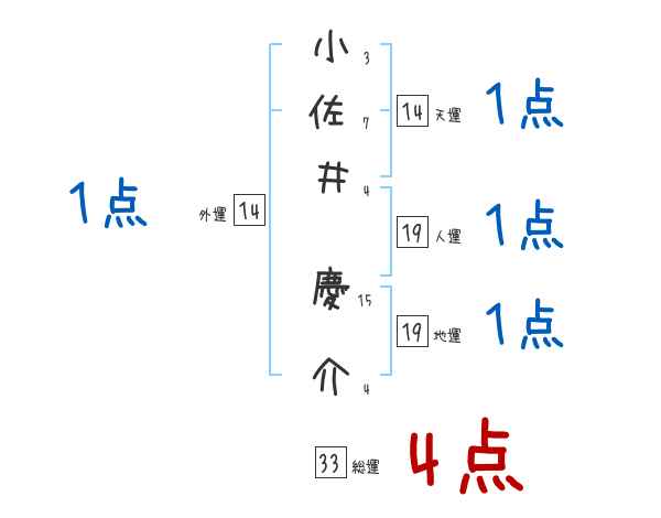 外運![]() | 小佐井慶介さんの外運は14画の1つ星!人に対して優しいがストレスを溜め込みがち。人間関係のトラブルを避けるよう気をつけましょう。 生活面を象徴する運勢です。外部から受ける影響力を表し、結婚運、家庭運や職場、環境への順応性を表します。 |