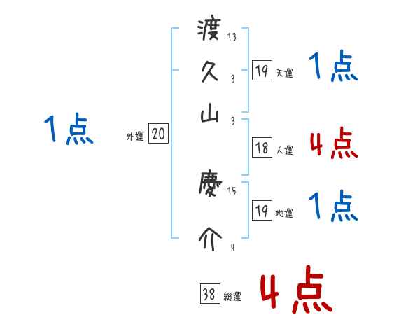 天運![]() | 渡久山慶介さんの天運は19画の1つ星!優れた才能を持ちますが、協調性が足りないことも。周りの人と協力する事を意識しましょう。 家系が持つ宿命的な運勢を表します。祖先から受け継いだ苗字ですので自分の力が及びません。家柄を象徴します。 |