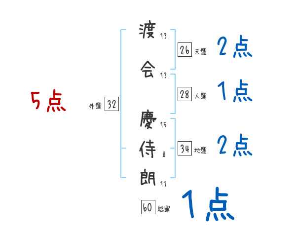外運![]() | 渡会慶侍朗さんの外運は32画の5つ星!柔軟性があり成功する。チャンスが多く金運が良い。 生活面を象徴する運勢です。外部から受ける影響力を表し、結婚運、家庭運や職場、環境への順応性を表します。 |