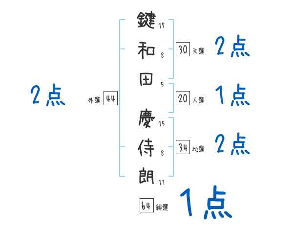 鍵和田慶侍朗さんの総運は64画の1つ星