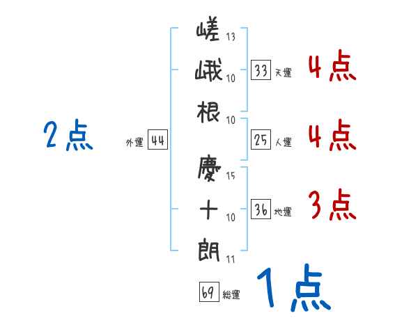 外運![]() | 嵯峨根慶十朗さんの外運は44画の2つ星!誠実で慎重な性格。物事を考えすぎないように注意しましょう。 生活面を象徴する運勢です。外部から受ける影響力を表し、結婚運、家庭運や職場、環境への順応性を表します。 |