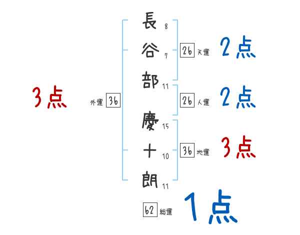 外運![]() | 長谷部慶十朗さんの外運は36画の3つ星!先見性が豊かです。多少神経質で苦労することも。 生活面を象徴する運勢です。外部から受ける影響力を表し、結婚運、家庭運や職場、環境への順応性を表します。 |