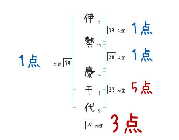 天運![]() | 伊勢慶千代さんの天運は19画の1つ星!優れた才能を持ちますが、協調性が足りないことも。周りの人と協力する事を意識しましょう。 家系が持つ宿命的な運勢を表します。祖先から受け継いだ苗字ですので自分の力が及びません。家柄を象徴します。 |