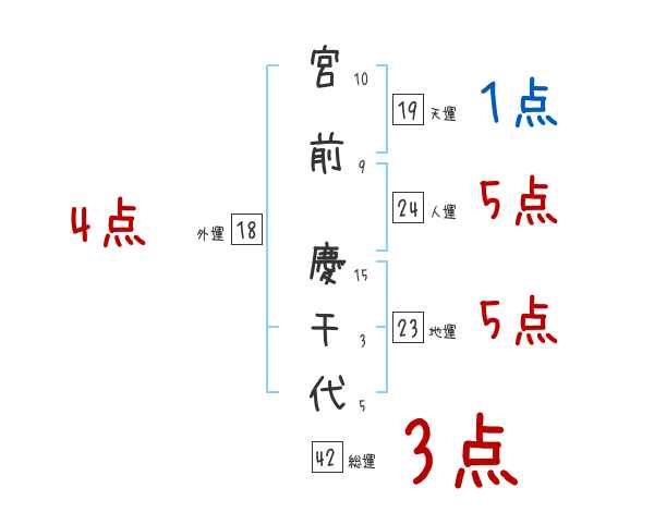 外運![]() | 宮前慶千代さんの外運は18画の4つ星!情熱的で剛気。忍耐力があり信頼される。 生活面を象徴する運勢です。外部から受ける影響力を表し、結婚運、家庭運や職場、環境への順応性を表します。 |