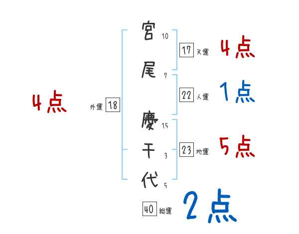 総運![]() | 宮尾慶千代さんの総運は40画の2つ星!自信過剰で物事に固執するためトラブルに注意。 あなたの人生を表す1番重要な運勢です。生涯を通じて影響する総合運となり、主に50歳以降の晩年期に影響を及ぼします。 |