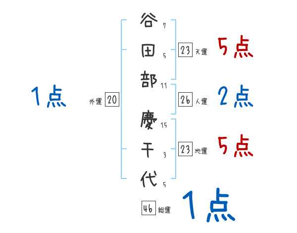 総運![]() | 谷田部慶千代さんの総運は46画の1つ星!迷走することが多く苦労するかも。目先のことにとらわれないように。 あなたの人生を表す1番重要な運勢です。生涯を通じて影響する総合運となり、主に50歳以降の晩年期に影響を及ぼします。 |