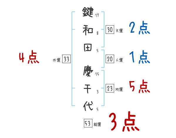 外運![]() | 鍵和田慶千代さんの外運は33画の4つ星!権力志向でプライドが高い。勇気があり運を切り開き成功する。 生活面を象徴する運勢です。外部から受ける影響力を表し、結婚運、家庭運や職場、環境への順応性を表します。 |