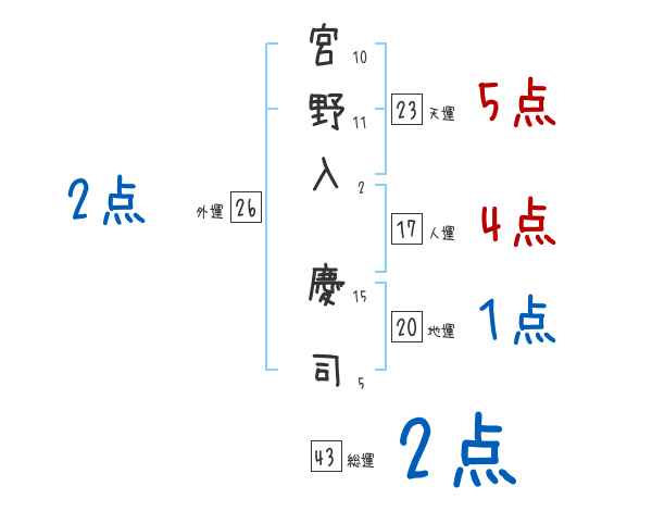 総運![]() | 宮野入慶司さんの総運は43画の2つ星!頑固な性格で独立心が強いかも。やや非現実的で浪費に注意しましょう。 あなたの人生を表す1番重要な運勢です。生涯を通じて影響する総合運となり、主に50歳以降の晩年期に影響を及ぼします。 |
