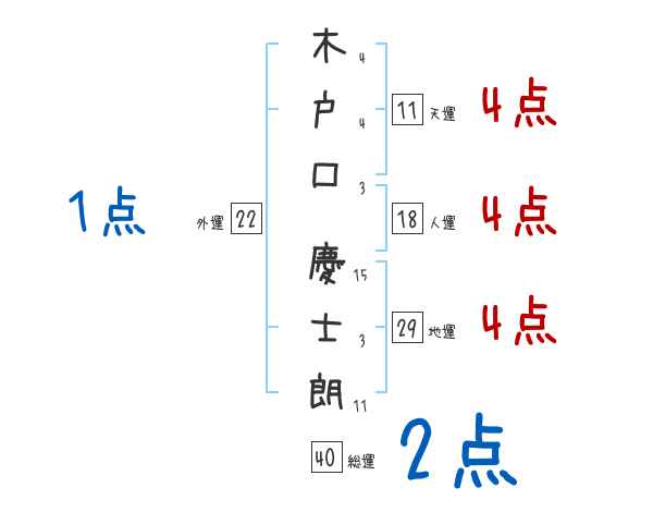 外運![]() | 木戸口慶士朗さんの外運は22画の1つ星!努力することが苦手ないっぽう手先が器用。芸術性にも優れる。 生活面を象徴する運勢です。外部から受ける影響力を表し、結婚運、家庭運や職場、環境への順応性を表します。 |